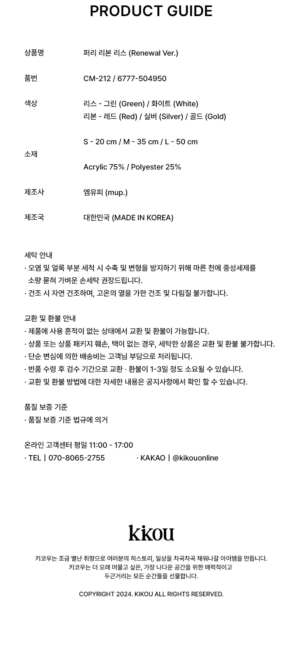 - 각 리본마다 매듭의 형태가 상이할 수 있으며 수령 후 매듭이 풀린 경우, 약한 힘으로 매만져 주시면 조정 가능합니다.